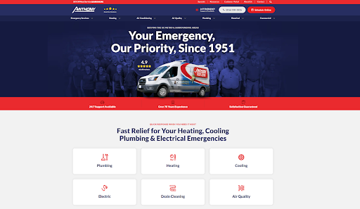 | Anthony Plumbing, Heating, Cooling & Electric | Plumbing, HVAC, electrical, air quality and drain services | NATE-certified, over 100 hours of annual training and Anthony University apprenticeship | Rapid emergency response, trusted technicians and whole-home expertise | Energy-conscious HVAC installations and optimized system operation | Priority maintenance, 24/7 support and professional home care protocols |